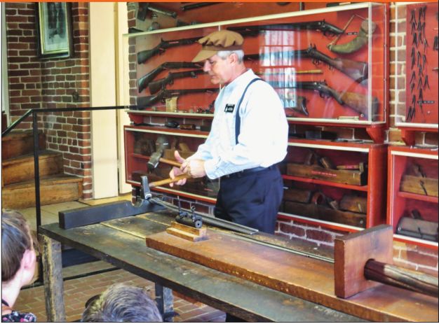 The tour of Jonathan Browning’s home and gun shop includes his gun collection, with some guns labeled, “Holiness to the Lord – Our Preservation.” His son, John Moses Browning, later became important in the development of modern automatic and semi-automatic firearms.