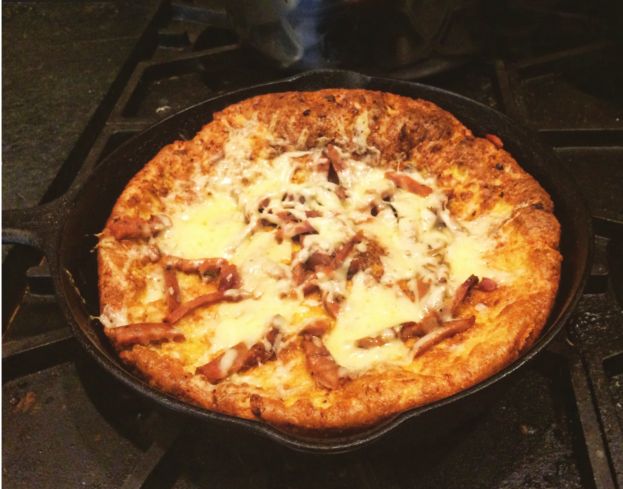 Place in the oven. Bake until the pancake is puffed and the edges and center have turned golden brown, about 20 minutes. Meanwhile, make sure the grated cheese and ham are measured and close at hand.