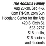 THEATRE/COMEDY | A macabre musical The kookiest, spookiest family around takes residency at the Hoogland Center for the Arts Aug. 28-30 and Sept. 4-6. The Addams Family, written by Jersey Boys authors Marshall Brickman and Rick Elice, features an original story based on the 1964 television series and the 1991 movie, both of which were spawned by the caricatures of cartoonist Charles Addams. Wednesday Addams has fallen love with a nice, normal, respectable young man from a good family – one that her parents have never met. She tells her father, Gomez, but begs him to keep the news a secret from her mother, Morticia. The family plans a dinner for the “normal” boyfriend and his family; they couldn’t have planned anything that happens next. Tickets for The Addams Family musical can be purchased in advance online at http://hcfta.org, or by calling the box office at 523-2787.
