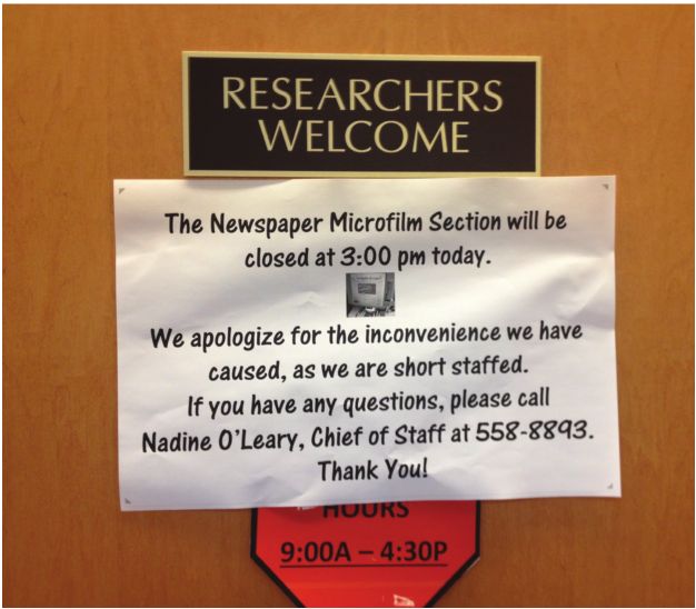 newspaper microfilm section will be closed at 3:00 p.m. today,” reads a