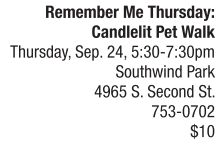 ANIMALS | Awareness for homeless pets This Thursday, bring your leashed pet(s) to Southwind Park and join the Animal Protective League, along with animal welfare organizations around the world, for a Remember Me Thursday pet walk and candle lighting ceremony. Candles will be lit globally at the same time to honor the millions of pets that have lost their lives without the benefit of a loving, forever home, as well as to raise awareness for the millions of pets currently awaiting adoption. After the candle-lighting ceremony, pizza will be provided to humans while pets enjoy games, treats and demonstrations. The pet walk begins at 7 p.m. Owners are restricted to no more than two pets per person, and will be asked to sign waivers for each animal brought on premises. Registration for the walk is $10 per person and includes one candle for the lighting ceremony. A limited number of additional candles will be available for purchase at $5 per candle. For more information about the Remember Me Thursday: Candlelit Pet Walk, contact the APL at 544-7387, or visit their website at http://apl-shelter.org.