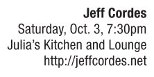 BAND SPOTLIGHT | Jeff Cordes With a winning smile and a pocketful of songs, Springfield-based singer-songwriter-entertainer Jeff Cordes brings on the music. Born in the capital city, raised in Lincoln and a graduate of Illinois College with a degree in philosophy, the introspective songsmith spent plenty of time elsewhere traveling and learning, but credits a mysterious “small town on the Sangamon River” as his creative center. After visits to Arizona and Nashville he returned to central Illinois to concentrate on his true love and passion of songwriting and performing. In June of 2015 while playing a gig at Rachel’s Cafe in Bloomington, Ind., Jeff recorded the performance (the whole hilariously told story is on his web site) and decided to release the effort as his first CD, appropriately called, Rachel’s Cafe. Since then, he’s been a busy folk singer, playing the 2015 Illinois State Fair (probably didn’t get paid), local clubs and several festivals, including this weekend at the Rochester Fall Festival and next weekend at Lincoln Memorial Garden’s Indian Summer Festival. Spend some time with Jeff and enjoy his thoughtful songs and fitting music. See also