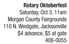FAIRS & FESTIVALS | Wilkommen! Bier! This Saturday, the Jacksonville Rotary Club’s annual Oktoberfest celebration celebrates a fifth year of fun, heritage and, of course, bier. Modeled after the 205-year-old Oktoberfest celebration of Munich, Germany, the event kicks off with a traditional Wilkommen (welcome) ceremony and Tapping of the Kegs at noon. The rest of day is jam-packed with entertainment. Enjoy live music by The “Heidelberg” German Band, performing their blend of “high-energy German oom-pah music” paired with hilarious commentary, plus the Waterloo Band. Other games, activities and contests will occur throughout the day, such as a keg toss, stein endurance (aka mug-holding) contest, beer-barrel obstacle course, pretzel-eating competition, human foosball, dachshund dash, pet parade, international beer and wine tastings and more. The traditional German meal of brats, “secret recipe” sauerkraut and potatoes will be served, along with other traditional German fare. For more information about the Fifth Annual Rotary Oktoberfest, visit http://test.jacksonvillerotary.org. To purchase advance tickets, call 408-0055. See also