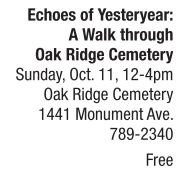 HISTORY | A Sunday stroll through history This Sunday, a popular walking tour returns to Oak Ridge Cemetery after a seven-year hiatus. The public is invited to enjoy a guided stroll through Oak Ridge Cemetery, during which they will learn about historical figures from Sangamon County. Costumed actors will be stationed at noteworthy grave sites to tell the stories of the people who lie there. Featured individuals will include Roland W. Diller, Vachel Lindsay, Dr. Henry Wohlgemuth, Judge Samuel Treat, Mattie Rayburn, Phoebe Florville, Rebecca Woods and Nellie Grant Jones. The outdoor walking tour is free and open to the public. In the event of rain, the tour will be moved to Sunday, Oct. 18, from 12-4 p.m. For more information about Echoes of Yesteryear: A Walk through Oak Ridge Cemetery, visit http://sangamonhistory.org or call the Sangamon County Historical Society at 525-1961.