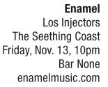 With Kevin Wasmer (vocals, guitar) and Sam Ganci (drums) as the core of the band’s hardhitting, melodic sound for several years, the recently recharged Enamel added Nick Beal (bass) and Tyler Landess (lead guitar, vocals) for a first show on Halloween after only five weeks of heavy-duty rehearsals. Nick and Sam are longtime members of Hush, an area Tool tribute band, while Kevin produced and recorded Tyler’s former metal band Dysfunctional Family in 2010, so when the time came for Enamel-ers Jason Ritter and Camron Yates to move on, the new guys seemed natural fits. Plans for 2016 include songs recorded live in the band’s private rehearsal studio to be released on SoundCloud and Bandcamp, with video versions on YouTube. Each single comes with an “ultra limited T-shirt” designed by local artists to uniquely fit the song subject. The band just copped a cool coup to open for national, touring rock group Wayland at the Castle Theater in Bloomington on Nov. 19 and continues to play local shows on a regular basis.