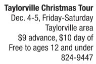 Feel the holiday spirit during the 24 th Annual Taylorville Christmas Home Tour, where six private homes will open their doors to the public. See Taylorville’s historic “Painted Lady” house, a landmark property that two Taylorville mayors have called home, a funky makeover, a “Mad Men”-style home, an Irish cottage and a dwelling featuring two waterfalls. Complimentary treats will be served at various sites. Other tour attractions include a holiday bazaar, decorated historic buildings, a cookie walk and an open house at Countryside Veterinary Services, where guests can visit an orphaned calf named Nova. Tickets can be purchased for $9 in advance at various locations throughout Taylorville, Springfield, Pana and Nokomis. On tour days, tickets can be purchased at all tour stops as well as Cottage Rose on the east side of the Taylorville square. For more information about the Taylorville Christmas Tour, call 824-9447.