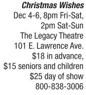 Christmas Wishes, The Legacy Theatre’s most frequently requested performance, returns this holiday season for four shows that will captivate and inspire individuals of all ages. Created in 2008 by director Scott Richardson, vocal director Judy Denton and choreographer Susan Collier, the original musical revue brings together a live, 10-piece swing orchestra and more than a dozen of Springfield’s most talented vocalists, including Greg Floyd, Sandra Fritz, Lori Ann McCabe, Cynda Wrightsman and more. Christmas Wishes is the only Christmas revue in the Springfield area that features both secular and sacred music. All arrangements have been created specifically for this show, which features more than 40 songs. Tickets can be purchased in advance; $18 for adults and $15 for seniors and children, or for $25 the day of the show. Advance tickets are recommended. For tickets and more information about Christmas Wishes, visit http://atthelegacy.com.