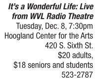 THEATER | An updated holiday favorite Enjoy a fresh adaptation of a classic holiday favorite on Tuesday, Dec. 8, by The Immediate Theatre Project of Asheville, North Carolina. In this innovative film-to-radioto-stage adaptation of It’s a Wonderful Life, several key employees of WVL Radio brave a blizzard to perform their station’s annual radio adaptation of Frank Capra’s beloved 1940s film. Still relevant today, It’s a Wonderful Life is a heartwarming tale of George Bailey and his Christmas Eve brush with death that encourages people to take stock of the things they hold dear and prioritize their lives accordingly. It’s a Wonderful Life: Live from WVL Radio Theatre features Springfield native Lauren Kriel as Mary Bailey along with other roles. Tickets are $20 for adults and $18 for seniors and students. To purchase tickets, visit http://hcfta.org. See also