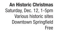 Hosted by the Springfield Heritage Sites Coalition, the fifth annual “An Historic Christmas” event highlights six of Springfield’s most beloved historic sites. During the event, the sites open their doors for an afternoon of special tours, holiday cheer, activities, performances, crafts and more. Participating sites are the Lincoln Home, the Illinois Executive Mansion, the Elijah Iles House, the Vachel Lindsay Home, Edwards Place and the Old State Capitol. Create Victorian-era Christmas cards at the Lincoln Home, see performances by the Eddy Flute Choir and the Old State Capitol Chorale at the Illinois Executive Mansion, hear local poets share their favorite seasonal works during a special “Poets at the Parlor” event at the Vachel Lindsay Home, see a Civil War Santa Claus at Edwards Place, enjoy snacks, games and photos with Santa at the Old State Capitol, and much more. This family-friendly event is free and open to the public. Sites may be visited in any order. For more information about the event, contact the individual sites mentioned above.