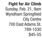 Help the American Lung Association raise funds to help those affected by lung disease while participating in central Illinois’ biggest stair climb on Sunday, Feb. 21, at 9 a.m. Participants are invited to climb all 32 floors of the Wyndham Springfield City Centre once or as many times as possible in a one-hour time period. Registration is $45 through Feb. 21 and $55 the day of the event. All participants, even those registering the day of, must meet a $100 fundraising goal into order to climb. The Fight for Air Climb encourages individuals to not only help those affected by lung disease but to take stock in their own health and fitness as they train to climb 32 flights of stairs. To register or get more information about the American Lung Association’s Fight for Air Climb, visit http://FightForAirClimb. org or call the American Lung Association at 787-5864. Save $5 on registration by entering code IT2016.