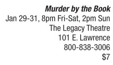 THEATER & COMEDY | A murderous meeting Join the Lanphier High School Drama Club for a murder mystery involving a gathering of the world’s greatest mystery writers, all attending under aliases of famous authors. A poetry-spouting “Shakespeare” quickly captures the affections of “Shelley”, “Bronte” and “Alcott” but the romance is thwarted when “Poe” reveals a nasty bit of correspondence and authors suddenly begin disappearing, one by one. It’s clear that one of the writers is trying to eliminate his or her competition – but whom? General admission tickets for Murder by the Book cost $7, and are available online at http:// atthelegacy.com, by calling The Legacy Theatre’s box office at 800-838-3006, or can be purchased in person from any Lanphier High School Drama Club member. See also