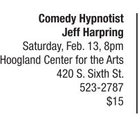 Try something different for your next date night or group outing, such as an evening with professional stage hypnotist Jeff Harpring. Jeff’s unforgettable stage show is based on hilarity and involves audience participation. His set is fun for all ages. Undergoing 20-30 minutes of hypnosis is a great way to experience mental and physical benefits equivalent to a full night of sleep. Jeff is a licensed board-certified hypnotherapist in solid standing with the National Guild of Hypnotists. He has trained under the Jerry Valley Ultimate Stage Hypnosis Program and The William Mitchell Institute of Hypnosis. Tickets to Saturday’s show cost $15, and can be purchased at http://hcfta.org. See also