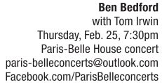 BAND SPOTLIGHT | Ben Bedford A stalwart on the local scene while playing folk music on regional, national and international levels, Springfield-based singer-songwriter Ben Bedford writes songs and sings them for folks. The Chatham native has toured in Scotland, England, Western Europe plus New Berlin, Kansas, Idaho, Michigan and other points across the country, making friends and music along the way. Venerable folk DJ Rich Warren of Chicago’s legendary WFMT radio named Ben to a list of “50 most significant folk singer-songwriters of the past 50 years” in July of 2010. All three of Bedford’s albums charted high on the Folk DJ and Euro-Americana charts with his 2012 release, What We Lost, also scoring well on the Roots Music Report. Currently he’s in the throes of a Kickstarter project (deadline March 11) to help finance his latest venture, The Pilot and the Flying Machine, recorded in early January 2016 and set for a May 1 release. Ben asked Tom Irwin, his friend and cohort in folk music adventures, to join him for a Paris-Belle House concert. Admission to this event requires a request to the email above for information. See also