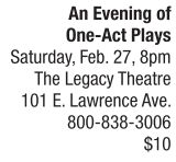 THEATER | Central Illinois Amateur Playwrights Enjoy an evening of three original, never-before-seen one-act plays produced by two local playwrights from the Central Illinois Amateur Playwrights organization. One-act plays are short scenes that offer the audience a glimpse into what would normally be a longer performance. The three contemporary plays are Coffee and Conversation by Jenny Loftus, Letters to Myself by Nicky Barton and Absence Makes the Heart by Jenny Loftus. Admission is $10 and seats are available on a first-come, first served basis. The doors and bar open at 7 p.m., and the show begins at 8 p.m. A questionand-answer session with writers and directors will occur at 9:30 p.m., followed by cocktails and mingling. For tickets and more information on An Evening of One-Act Plays, visit http://atthelegacy.com. See also