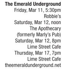 As witnessed above, this is definitely the busiest band in Celtic show business during the St. Patrick’s Day celebrations in Springfield. 2016 marks the 15th year in the existence of The Emerald Underground concept and experience. 2016 also marks the second year the lineup of Megan Turner (fiddle, vocals), Bill McKenzie (bass, vocals), Lori McKenzie (vocals, percussion), Jack White (vocals keyboards, guitar), Chas Blythe (electric guitar, vocals) and Nad Radwine (drums, percussion) takes the stage at the several gigs the long-running band lines up every year during the season. The idea of combining Irish songs with rock influences first started around here with Stone Ring Circle, our area’s first Celtic fusion group, the predecessor of The Emerald Underground. Through the years several members have come and gone, adding a particularly colorful history to the evolution of the group, including self-produced CDs, TEU swag, countless gigs and a pint or two of the good stuff. The band promises new tunes and old favorites performed in the unique stylings of Celtic fusion as only TEU can bring to the stage.