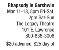 DANCE | Bringing the songs of George Gershwin to life Paired with a live jazz combo and some of the area’s finest vocalists, the Springfield Ballet Company brings the magic of George Gershwin to life during four performances of Rhapsody in Gershwin. Featured pieces include “Someone to watch over me,” “Fascinating rhythm,” “An American in Paris” and more. The show is choreographed by Anna Bussing, Susan Collier, Grace Nanavati, Julie Ratz, Gina DeCroix Russell and Gary Shul. Vocals are contributed by Greg Donathan, Lori Ann McCabe, Joshua Ratz, Mary Kate Smith and Cynda Wrightsman. The performance is directed by Damien Kaplan. Advance tickets cost $20, and can be purchased online at http://atthelegacy.com. Ticket price increases to $25 the day of the show.