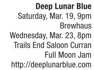 BAND SPOTLIGHT | Deep Lunar Blue When a group calls itself an “American rock band from Springfield, Illinois” on their website’s homepage, you know they better mean it. Deep Lunar Blue has been setting a standard of original and classic rock jam music in the local scene like no one else does or can since 2009. The talented and diverse bandmates of Casey Cantrall (guitar, vocals), J.J. Moffat (drums), Jay Bohn (bass), Tony Turasky (guitar, vocals), Zach Eymann (harmonica, vocals) and David Alexander (tenor saxophone) bring a wide variety of tastes to the table and it shows in the intensely provocative setlist. Bridging the gap through generations of rock by covering music from the Grateful Dead to Wilco, Bob Marley to Talking Heads, Johnny Cash to Jack White, Led Zeppelin to Widespread Panic, the innovative group also intersperses interesting and captivating originals that fit the canon like a glove. The busy band, now nearing 250 total gigs, host an annual Derby Day Party, play Midwest music festivals plus area bars, and released an album called Watch it Burn in 2010. See also