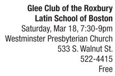 On Saturday, March 18, enjoy a complimentary concert by the Glee Club of the Roxbury Latin School of Boston. Founded in 1645, The Roxbury Latin School of Boston, Mass., is the oldest boys’ school in America, priding itself on a long tradition of educating bright boys in grades 7-12 from various backgrounds and all segments of Boston. This captivating night of music will feature sacred repertoire, folk music, musical theater and traditional a capella songs for men’s chorus by the schools’ choir and Latonics ensemble. The Glee Club of the Roxbury Latin School of Boston operates under the leadership of Rob Opdyke, who has served as the school’s director of music since 1999. Under Rob’s direction, the club has toured throughout the United States as well as Bermuda, England, Central Europe and more. For more information about this special performance, contact Westminster Presbyterian Church at 522-4415.