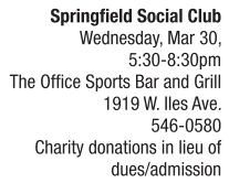 CLUBS & MEETINGS | Socialize for a cause The Springfield Social Club is a philanthropic group that aims to provide social, cultural, altruistic and networking opportunities to local professionals of all ages. The club was formed in 2007 by Dave Martin and Jenny Waldinger. Springfield Social Club gatherings are held monthly at a local bar or restaurant. In lieu of club dues or an admission fee, attendees are asked to bring specific items from a charity wish list. The hosting restaurant/bar offers complimentary appetizers to SSC members in exchange for bar business. At the end of the evening, local bars and restaurants make revenue, a charity is helped and a good time is by all. This month’s Springfield Social Club gathering benefits the Cystic Fibrosis Foundation, whose wish list items are bottled water and granola bars. To get more information about upcoming Springfield Social Club events, find the group on Facebook. See also