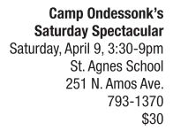 CHILDREN’S CORNER | Summer camp fun Enjoy a full week of summer camp condensed into one fun evening during Camp Ondessonk’s Saturday Spectacular on Saturday, April 9, from 3:30 to 9 p.m., at St. Agnes School in Springfield. Some of Camp Ondessonk’s very own staff will supervise children ages 6-14 during the drop-off event which features games, camp food, tie-dye, other “camping” activities and more. Camp Ondessonk is a 983-acre, not-for-profit youth summer camp located adjacent to the Shawnee National Forest near Ozark. In operation since 1959, Ondessonk is widely considered one of the most scenic summer camps in the United States, offering a traditional approach to summer camp by immersing participants in a fun, adventurous and supportive community. Admission is $30, and includes food, games and prizes. Bring a canned good to receive $1 off admission. Registration is requested, though walk-ins will be accepted. To RSVP, send an email with your child’s name to [email protected].