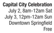HOLIDAY HAPPENINGS | Fun for the Fourth Usher in our nation’s birthday with two days of family fun hosted by the Springfield Jaycees during the annual Capital City Celebration. The festivities begin at 8 a.m. on Saturday, July 2, with a CrossFit competition hosted by Rail Splitter CrossFit. A cornhole bags tournament hosted by Capital City Cornhole LLC begins at noon, along with registration for a hot dog eating contest and the opening of the Bloody Mary bar. Enjoy live music on the entertainment stage at Fifth and Capitol by Hipbone Sam from 4-7 p.m., and Fun DMC from 8-11:30 p.m. The fun resumes on Sunday, July 3, with a dog pageant at 12 p.m., a beauty pageant for ages 10 and under at 4 p.m., plus live music by New City Road and The Shenanigans. Other Sunday attractions include giant inflatable obstacle courses plus a 25-foot inflatable rock climbing wall, both available from 12-8 p.m. Don’t miss the main attraction, the annual fireworks display, beginning at dusk Sunday night after a patriotic concert by the Springfield Municipal Band. For more information about the Capital City Celebration, find the Springfield Jaycees on Facebook. See also