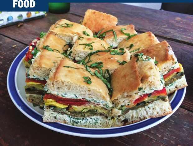 Spread the cheese mixture over both halves of the bread, then layer the vegetables and basil leaves on top of one half. Top with the other half of bread and wrap the sandwich tightly with plastic wrap. Set a weight, such as a brick or large cast-iron skillet, on top for about 30 minutes. Slice into sections and serve.