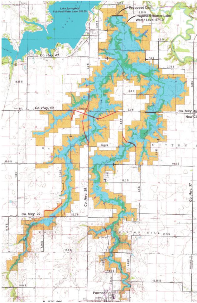 Outside Springfield, Pawnee Mayor Jeff Clarke doesn’t like the idea of a lake lapping up against his town, as maps show Hunter Lake would, but he says he’s not worried.