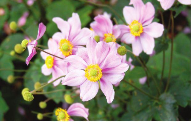 Anemones have dark green leaves with two- to three-inch in diameter flowers held high on delicate wiry stems. Colors range from pure white to pink or purple. Flowers may be single to semi-double or doublepetaled. The cultivar Margarete has semidouble flowers of striking pink with yellow centers. At three feet tall, it’s an amiable choice for backgrounds.