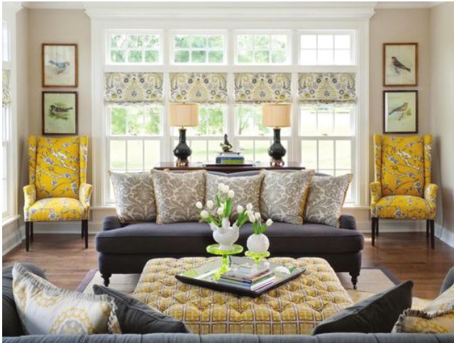 In their living room, the floor-to-ceiling windows got a zip of pattern, thanks to sensational Roman shades. The pattern is bold but, done in a palette of soft grays and yellows, it supports the design choices in the room, accenting without overwhelming.