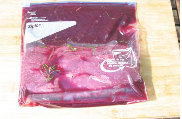 To conduct my beer cooler sous-vide experiment, I thawed a flatiron steak and placed it in a gallon Ziploc slider freezer bag. I added last night’s leftover Malbec wine, a couple spoonfuls of capers, a few sprigs of rosemary, some garlic salt, and pepper. I removed the air and allowed it to marinate while I went off to hear some music.