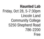 The Lincoln Land Community College Chemistry Club hosts its fourth annual “Haunted Lab” on Friday, Oct. 28, on the upper level of Sangamon hall at Lincoln Land Community College.