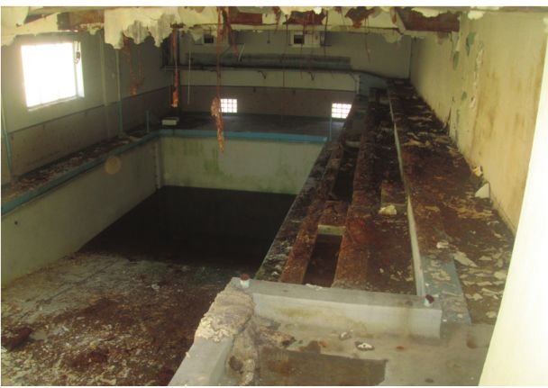 Now, the roof has decayed, leaving the interior open to the sky. Dirty water covers the bottom of the pool, and the floor is littered with peeled paint and pieces of the ceiling. Mold and algae have proliferated, and exterior bricks from the top of the southeast corner fell to the sidewalk a few years ago. City inspectors say the building is unsafe.