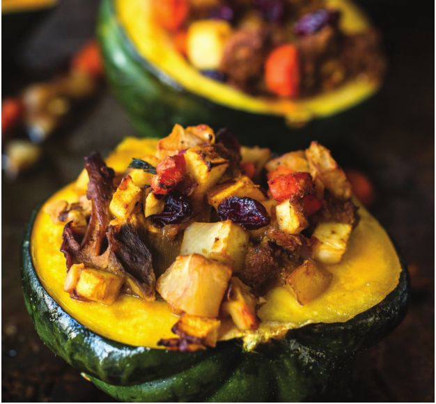 5. Divide the mixture among the hollows of the acorn squash halves, mounding but not overflowing. Cover with foil. Bake for 45 minutes, remove foil, and continue to cook for 15 minutes, or until the squash is forktender. Serve warm.