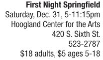 The First Night tradition began in Boston on New Year’s Eve, 1975, when a handful of the city’s artists and musicians sought an alternative to the drunken shenanigans behind most major holiday celebrations. The alcohol-free alternative quickly caught on across the United States, and the Springfield Area Arts Council is proud to host one of the longest-running First Night celebrations in Illinois and one of the remaining First Night celebrations in America. The SAAC’s 30 th annual event begins with children’s activities and performances at Springfield High School from 1-4 p.m. The festivities continue downtown from 5-11:15 p.m., with a wide variety of music, dance, theater and comedy at the Hoogland Center for the Arts, Lincoln Library, Grace Lutheran Church, Lincoln Home Visitor’s Center, Central Baptist Church and Kari Bedford Photography. The annual fireworks display is scheduled for 8 p.m., to be launched from the intersection of Fourth Street and Capitol Avenue. New to this year’s festivities is the Black Sheep Café stage featuring teenage musicians, a food truck concession area, strolling performers and a First Night merchandise tent. Advance tickets cost $18 for adults and $5 for ages 5-18. For more information about First Night, including the full schedule, visit http://springfieldartsco.org.