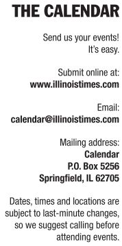 Contrasting Forms Exhibition Jan 26-28, 31, Feb 1, 2-4, 7-9, 10am-5pm Tue-Wed, 12-7pm Thu- Sat. Exhibition features the work of featuring the work of painter Dan Grossmann, sculptor Wiley D. Jenkins and pastelist Tracey Maras. On display though Mar 2. Free. springfi eldart.org. 217-523-2631. SAA Collective Gallery, 420 S. Sixth St., 544-2787.