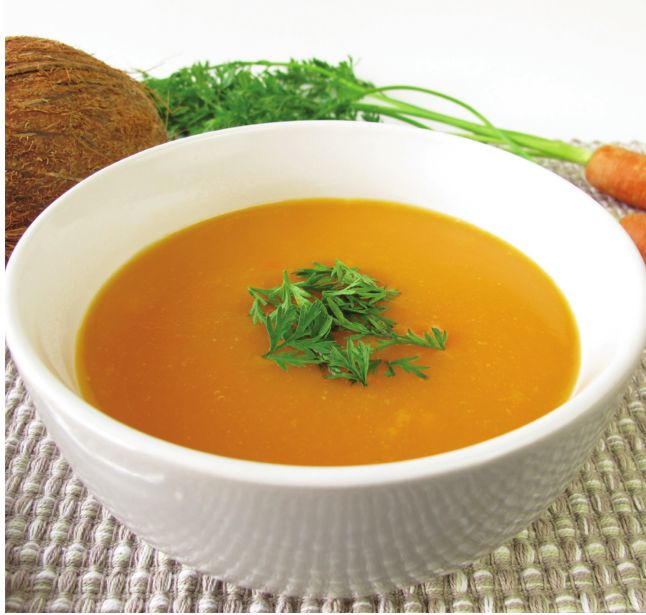 Add turmeric and stir briefly, then add carrots, chicken stock, coconut