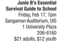 On Friday, Feb. 17, enjoy a musical adventure based off the popular book series by the late children’s author Barbara Parks. The Junie B. Jones book series was created for beginning readers and came to number 28 books in length. Today, the books have sold more than 55 million copies internationally and been translated into a dozen languages. Much like Ramona Quimby, Pippi Longstocking or Eloise, Junie B. Jones is an impish, outspoken perpetual six-year-old with an imperfect grasp on the English language who is a positive role model for children everywhere. In this familyfriendly show, Junie shares the expertise she has gathered during her school experience to illustrate that school can be sometimes be scary or fun, but always worthy of song and celebration. Don’t forget to arrive early for pre-show activities and crafts in the lobby, starting at 6 p.m. To purchase tickets to Junie B’s Essential Survival Guide to School, visit http:// sangamonauditorium.org or call 206-6160. See also