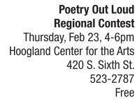 In 2005 the National Endowment for the Arts and the Poetry Foundation established the Poetry Out Loud contest, which utilizes poetry as a vehicle to test teenage students on their oration and interpretation skills. The contest, open to high school students in all 50 states, the District of Columbia, the U.S. Virgin Islands and Puerto Rico, requires teenagers to analyze and memorize classic or contemporary poems for public recitation. The program is instrumental in helping adolescents establish public speaking skills, build self-confidence, and learn through poetry. Poetry Out Loud contests originate at the classroom level; classroom winners advance to the school level; school-level winners compete at a regional level; and regional winners will advance to the national finals, which will be held in the District of Columbia April 25-26. The central Illinois regional contest is administered by the Illinois Arts Council Agency in partnership with the Springfield Area Arts Council, and features recitations from school-level winners from 15 area high schools. For more information about Poetry Out Loud, visit http://springfieldartsco.org or call the SAAC at 753-3519. See also