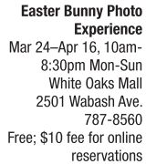 Kids can meet with and pose for a commemorative souvenir photo with the Easter bunny during White Oaks Malls’ Easter Bunny Photo Experience sponsored by The Gymboree Corporation and Universal Pictures Home Entertainment. In addition to meeting the Easter bunny and posing for a photo, each child will receive a special Sing-themed headband and activity book. Those wishing to meet the bunny with no wait time are invited to make a reservation online at http://simon.noerrbunny.com. There is a $10 fee for online reservations. Additionally, White Oaks Mall has partnered with Autism Speaks to host a sensory-friendly Caring Bunny Photo Experience for children with autism and other sensory challenges on Sunday, March 26, from 9-11:30 a.m. During this 2.5-hour period, the mall will eliminate as many sensory triggers as possible such as turning off in-mall music, stopping the escalators and drinking fountains near the event, eliminating queue lines and more. For more information about the Easter Bunny Photo Experience, call 787-8560. See also