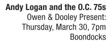 If you’ve got a hankering for some electric blues, rock or psychedelic, guitar-based music, look no further than Andy Logan and the O.C. 75s. Mr. Logan, along with John Hussey, his comrade in the 80s for the Geffen-signed band Little America (remember “Walk on Fire?”), plus Brian Glass on drums and vocals, proceeds to play the holy be-holy out of the sound and genre, knocking it out of the park while rounding and covering all the bases. They practically re-invented twang, feedback, growl, surf, fuzz and acid-laced rock guitar on his latest album Transistors of Mercy, available on Koan Records from Nashville, Tennessee. Logan is an award-winning songwriter but takes his guitar playing very seriously, especially the tone and the riffs, building this complete recent record and live show around his guitar sound and style. As Andy likes to say, “I don’t play background music,” and he means it. That goes ditto for Owen & Dooley Present:, the local, opening act that always comes across as cool and complete on the concert stage.