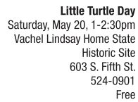 On Saturday, May 20, don your green or best turtle-themed outfit to celebrate World Turtle Day three days early at the Vachel Lindsay Home State Historic Site. Children of all ages are invited to the historic home to hear and learn about Vachel Lindsay’s poem titled “The Little Turtle” and act out the poem using puppets. Additionally, volunteers from the Henson Robinson Zoo will be on site with live turtles, and a turtle-themed make-and-take craft activity will be offered. For more information about Little Turtle Day, visit http://vachellindsay.org or call 524-0901. See also