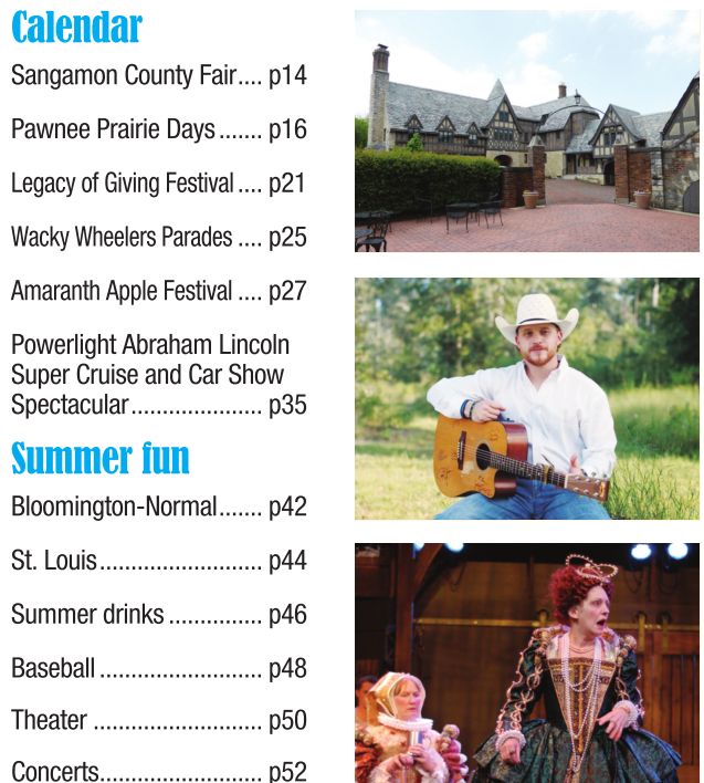 Old Capitol Farmers Market May 27, 31, Jun 3, 7, 10, 14, 17, 21, 24, 28, Jul 1, 5, 8, 12, 15, 19, 22, 26, 29, Aug 2, 5, 9, 12, 16, 19, 23, 8am- 12:30pm. Shop local produce, meats, cheeses and more. Entertainment on Saturdays includes chef demonstrations, live performances and activities. Free admission. downtownspringfi eld.org. Downtown Springfi eld, Inc., 3 W. Old State Capitol Plaza, 544-1723.