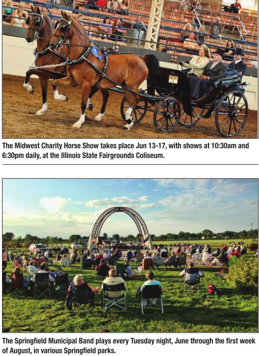 Midwest Charity Horse Show Jun 13-17, 10:30am and 6:30pm daily. Premier US horse show features American Saddlebred, Roadster, Morgan and Arabian horses and Hackney ponies. Performances at 10:30am and 6:30pm daily. Free. midwestcharity.com. Illinois State Fairgrounds, 801 Sangamon Ave., 782- 6661.