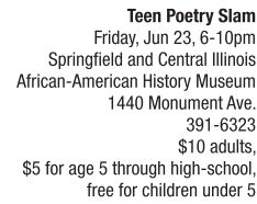 As part of their mission to offer programs and spaces where teens and children can explore and engage with history in a fun way, the Springfield and Central Illinois African-American History Museum’s education committee is hosting a Teen Poetry Slam Friday, June 23, from 6-10 p.m. All area teens are encouraged to compose and perform original poetry for an audience and a panel of three judges. The slam will be hosted by Eric Rivers of Expressions in the Dark, DJed by Tony Muse, and will feature guest poet Leroy Newborn. Monetary prizes ($200 for first place, $100 for second place and $50 for third place) will be awarded to the top contestants. Entry fee is $5 for contestants; regular admission costs $10 for adults, $5 for children age 5 through high school, and is free to children under age 5. High school students will be required to provide a valid school ID in order to receive the $5 admission fee. Questions about the Teen Poetry Slam can be directed to 391-6323. See also