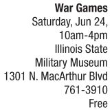Don’t miss War Games, a one-day event organized by Lizzie Roehrs, a junior communication major at the University of Illinois at Springfield and current intern at the Illinois State Military Museum. War Games is an interactive event where attendees can talk with reenactors and historians, examine historical equipment popularized in video games such as “Call of Duty: World at War,” try on WWII uniforms, take in reenactments and weapons displays, view artifacts not normally on display to the public and explore a re-created trench. Says Roehrs: “I wanted to find a connection between entertainment and history that would appeal to people who aren’t usually museum-goers. I also wanted to show people who play these games that there is more to the history than what they see in a video game.” For more information about War Games, email Roehrs at [email protected] or contact the Illinois State Military Museum at 761-3910. See also