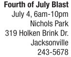The fun begins bright and early this Fourth of July in Jacksonville. Nichols Park will once again be the site of the annual Fourth of July Blast, a family-friendly celebration featuring fitness activities, live entertainment, kids’ attractions, fireworks and much more. The kids’ fishing tournament will kick off the festivities at 7 a.m., followed by the annual 5K and Fun Run at 8 a.m. Relax and collect free candy during the Jacksonville Rotary Club’s annual Fourth of July parade at 10 a.m., whose route leads from Duncan Park to the downtown square. The kids’ zone will open at noon, featuring activities for all ages including inflatables, old-fashioned games, fire safety houses, Superheroes Saving Smiles, the Princess Project and more. Other highlights include animal attractions such as Nolan’s Petting Zoo and Exotic Animals, Kretzer’s Pony Pals and pet competitions such as the Patriotic Pet Contest, Chihuahua Only Pet Contest and Wild Wild Wiener Dog Races. The Pavilion’s main stage will feature live entertainment from 11:30 a.m. onward, including a veteran’s ceremony, baby contest and headlining concert by Fun DMC. The festivities will conclude with a fireworks display over Lake Mauvaisterre beginning at 9:30 p.m. Questions about this event may be directed to 243-5678. See also