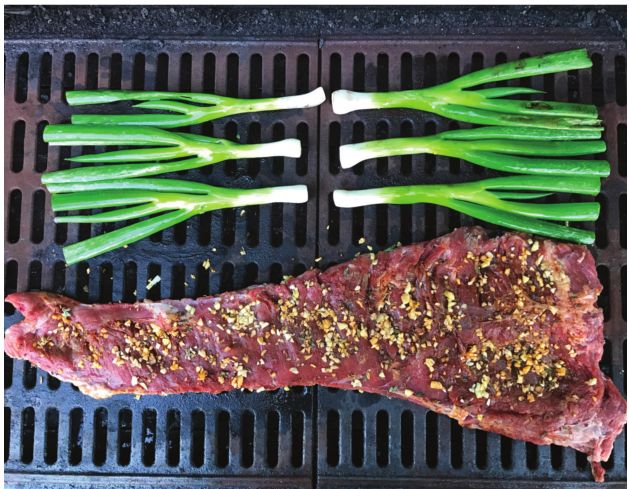 When I met up with Bud at the next festival, he handed me a big butcher paperwrapped bundle of skirt steaks. I seasoned them with salt, pepper, garlic, paprika and dry oregano and repackaged them in zip-top bags with a generous amount of olive oil. The steaks spent the night in the beer cooler. I should mention that our campsite was very close to the stage. The next evening, between bands, I started up my grill and spread the long thin steaks over the grates. As they cooked, olive oil dripped onto the burners and created dense clouds of smoke which blew out to the stage. The sound check was interrupted by musicians coughing due to the smoke, delaying the start of the next set. Solo artist Jaik Willis wandered over to the bus into the epicenter of the smoke cloud. “Hey Jaik! Want some Romanian Skirt Steak?” Bud asked. “Well I’m a vegetarian, but I’m also a Romanian,” he replied. “Sometimes in life, you have to make choices!”