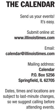 Music at the Museum: Switchback Jul 13, 7-9pm Thu. Awardwinning duo of Brian FitzGerald and Martin McCormack draws on traditional Celtic music and original Americana songs that refl ect their Irish heritage and Midwestern roots. $10 at door; $8 museum members and children under 12. illinoisstatemuseum.org. 782- 5949. Illinois State Museum, 502 S. Spring St., 782-7386.