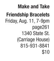 It Enjoy a fun night out with your neonate Friday at page261, a boutique-style shop that offers a variety of creative “make-and-take” activities for children and adults. From 7-9 p.m., children ages 7-12 plus an adult will learn a variety of braiding techniques and create a stylish, colorful piece of wearable art. The activity cost is just $10 and includes all materials for both adult and child. Drinks and snacks will not be available on site, but all participants are invited to bring their own. Since space is limited, registration is encouraged, and can be completed online at http:// pagetwosixtyone.com. More information about page261, including a schedule of upcoming make-and-take events, can be found online as well.