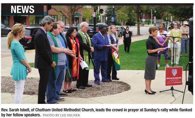 The first speaker, Rev. Sarah Isbell, pastor at Chatham United Methodist Church and member of the Greater Springfield Interfaith Association, wasted no time in naming what she believed to be the root causes of the events in Charlottesville. “We must say ‘no more’ to the evils of racism and white supremacy,” she said. “Racial terrorism – bigotry, hate and white privilege – have built walls that divide the powerful from the oppressed and keep us from seeing each other’s faces.”